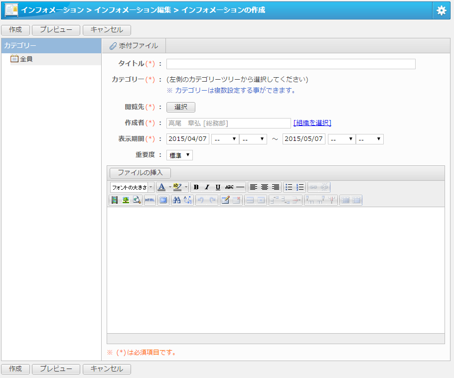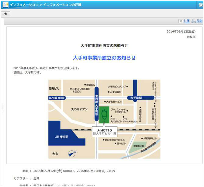 掲示板に社内への通達事項・お知らせを掲載できます。 部署や発信する内容ごと、役員向け等の宛先ごとなど、様々な切り口でカテゴリを作成し、分類して掲載できます。また、公開日・時間を指定しておけば、事前に作成した掲載内容を指定の日時に自動的に掲載できます。その他、画像アップロードに対応したリッチエディタを搭載。文字を装飾して、注目してほしい箇所を目立たせたり、画像を直接掲載するなど、わかりやすいお知らせを簡単に作ることができます。