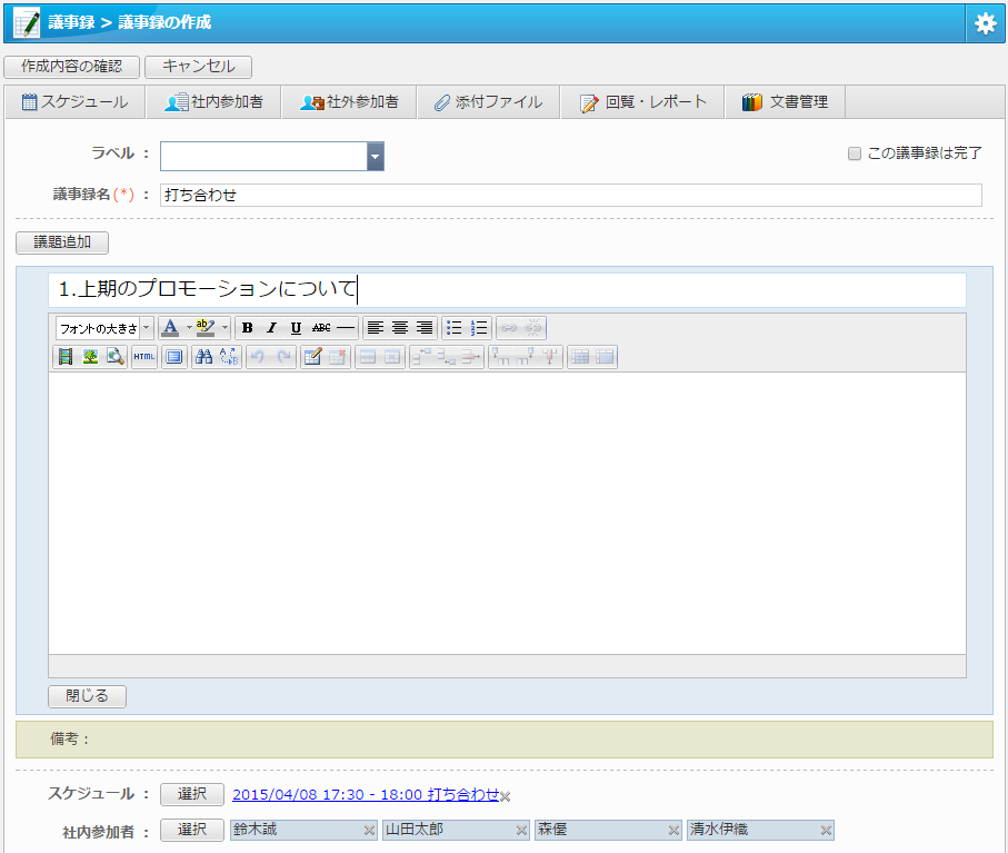 議事録は文字の大きさや色を変更できるエディタでわかりやすく作成できます。