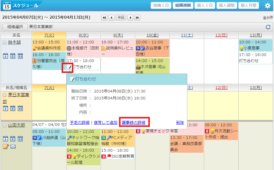 会議の前にアジェンダ(進行表)を登録して共有、会議後は議事録を作成することができます。