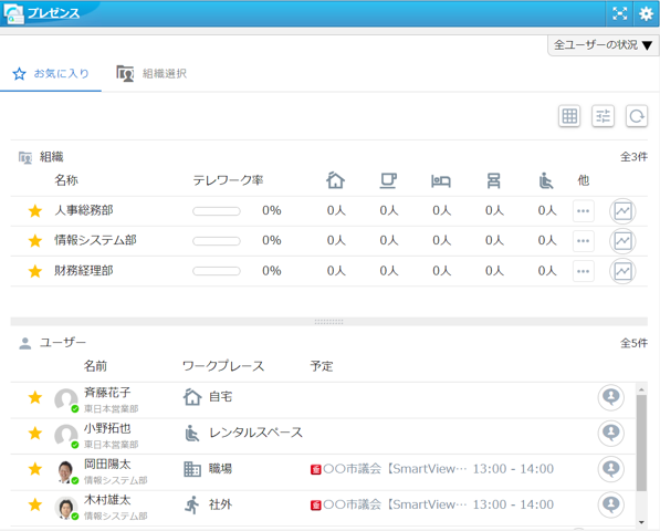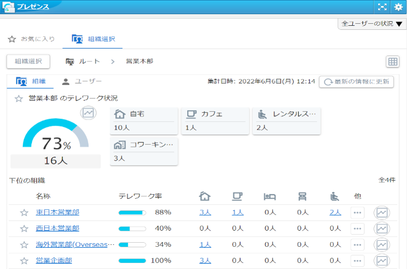 勤務場所を共有することで全社のテレワーク率が分かります。テレワーク状況について週間・月間などの統計データも確認可能です。組織に所属するメンバーの勤務状況や、在席中・離席中などのステータスが共有でき、組織内の状態を可視化します。