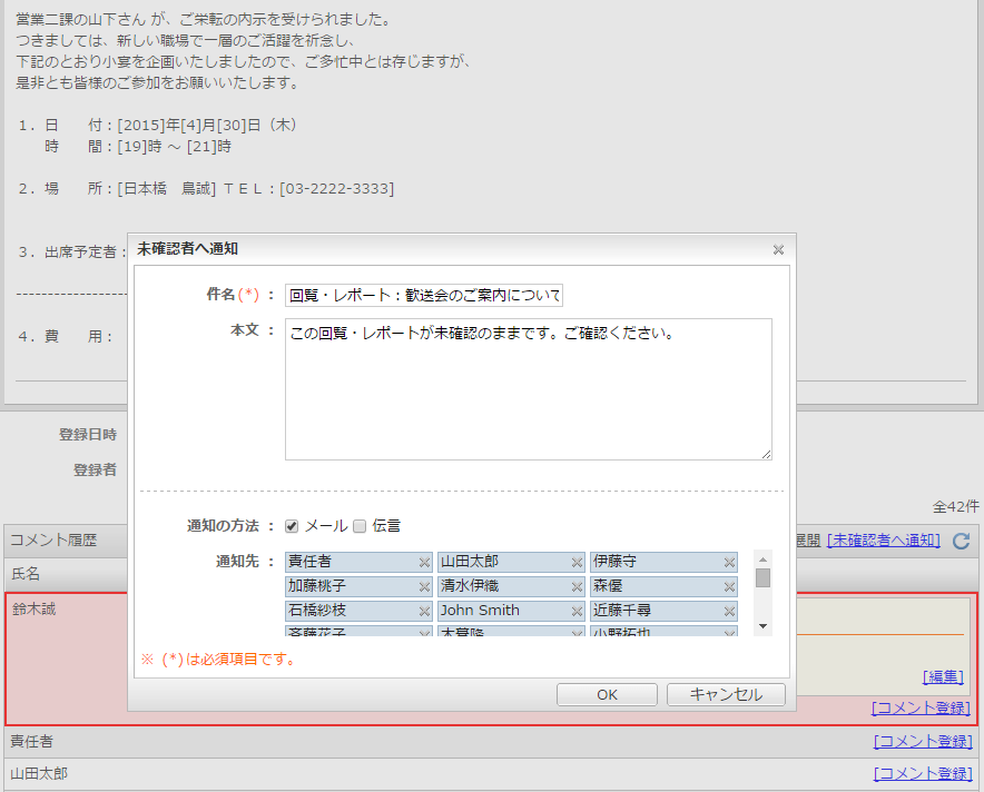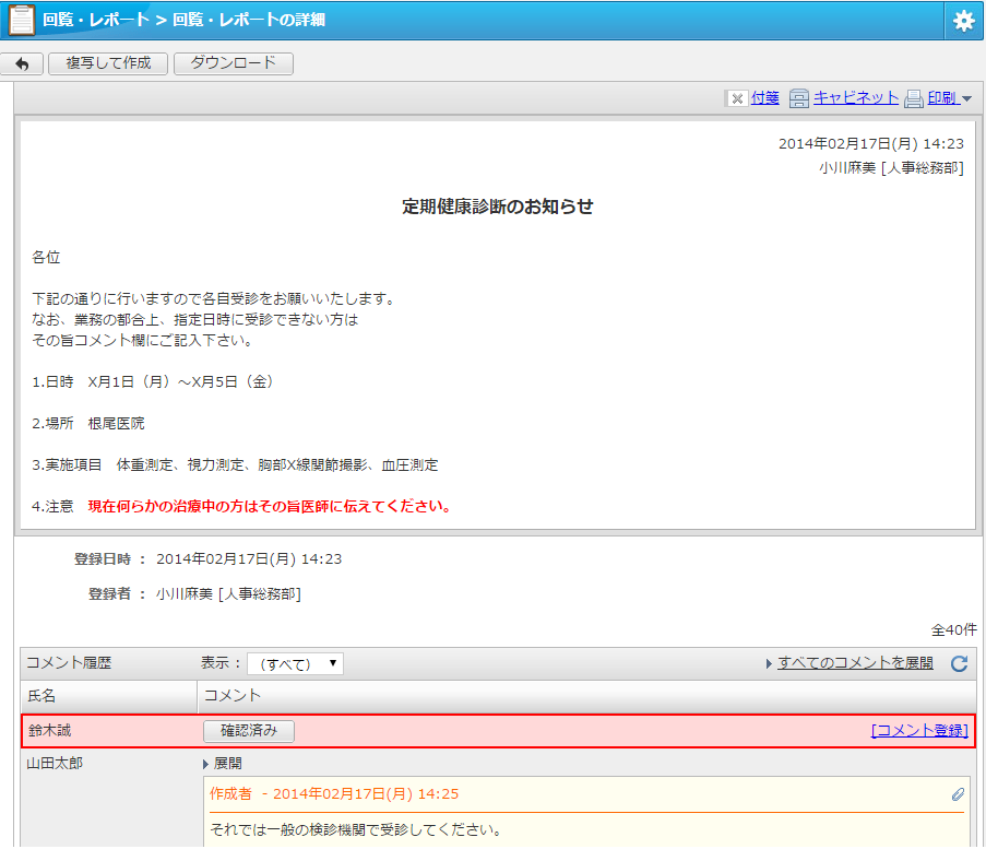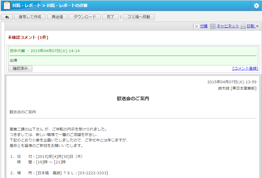 複数人への情報回覧や報告書の提出ができ、社内メールのようにご利用いただくことができます。 複数人に情報を回覧した際に、誰が閲覧したのかがわかり、未読の人には回覧内容を再送信することができます。回覧後は、作成者と回覧先との間でコメントを交換、情報共有できます。多人数宛にファイルを送付しても、1箇所でデータやファイルを共有するため、Eメールで何度もやりとりするよりも情報整理がしやすいです。またテキストベースの書式を登録、簡単に文書作成することができます。