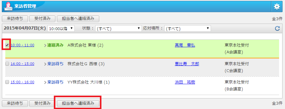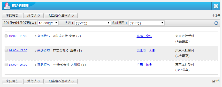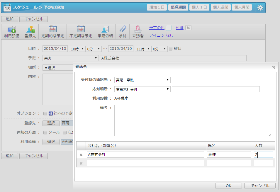 来訪予定のお客様情報を受付担当者と共有することによって、受付業務を効率化します。 スケジュールの登録を行う際に、来客の情報を合わせて登録することで、事前に受付担当者に会社名や人数、どこへ案内してもらえばよいかを知らせることができます。また、受付担当者はその日のお客様の来訪予定や案内する会議室、応対する従業員の内線番号など、必要な情報を事前に把握できるため、応対者へスムーズに取り次ぐことができます。