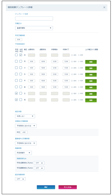 一週間の予定に関する設定・・・ 曜日ごとの労働日区分/予定出退勤時刻/休憩時間