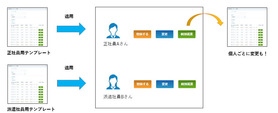 従業員ごとに就業に関する条件を設定できます。同じ条件の従業員が多い場合には、条件ごとのテンプレートを作成してテンプレートを適用したり、テンプレートを基に個人ごとのカスタマイズをすることができます。
