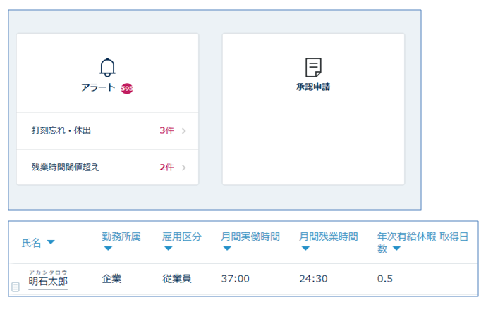 また、勤怠実績において、打刻漏れや残業時間の閾値超え等のアラートを受け取ることができます。